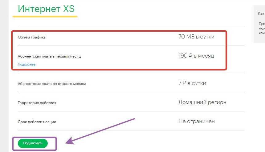 Условия пакета и подключениеДанный пакет рассчитан на минимальную эксплуатацию функции выхода в сеть. Потому стоимость опции вполне подходящая – всего 7,00 руб. за сутки.