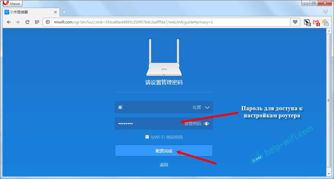 В следующем окне нам нужно установить пароль, который будет защищать настройки роутера. Этот пароль нужно будет указывать при входе в настройки маршрутизатора. Пропишите пароль, и нажмите на кнопку, чтобы продолжить. Если вы хотите, что бы пароль от роутера был такой же как пароль от Wi-Fi, то можно просто поставить галочку. Но я не советую так делать.