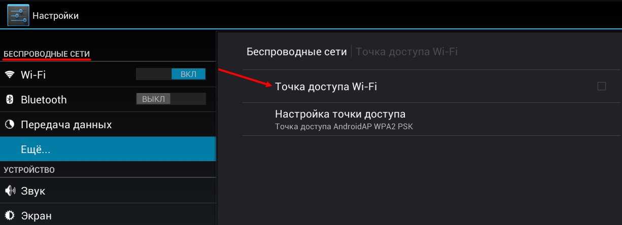 Этот способ намного проще и позволяет обеспечить интернетом сразу несколько девайсов посредством сети Wi-Fi. Чтобы им воспользоваться, нужно активировать режим модема на планшете. Он обычно находится в первом блоке настроек, в одноимённом пункте. Открываем его и ищем «Точку доступа Wi-Fi» или, возможно, «Wi-Fi HotSpot», или ещё что-то подобное, так как у разных производителей на разных версиях операционной системы названию пунктов меню могут отличаться.