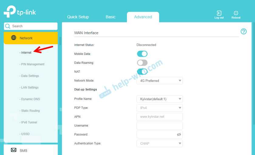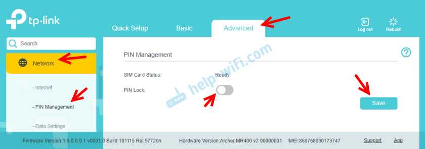 Все параметры, которые связаны с подключением к интернету через сеть мобильного оператора находятся на вкладке «Advanced», в разделе «Network». Если сразу появится сообщение связанное с PIN-кодом, значит SIM-карта заблокирована. Нужно перейти в раздел «Network» – «PIN Management» и ввести PIN-код (указан на карточке от SIM-карты, если вы его не меняли). Либо отключить блокировку PIN переключателем напротив «PIN Lock».