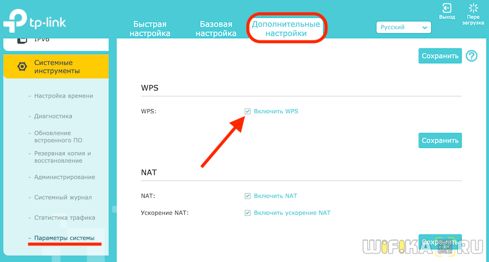 Она находится в верхней вкладке «Дополнительные настройки». Здесь в боковом меню в разделе «Системные инструменты» нужно открыть пункт «Параметры системы» и установить флажок на «Включить WPS», после чего нажать на кнопку «Сохранить».