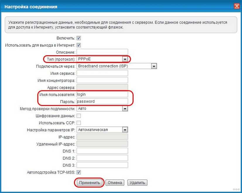 - В соответствующих полях указываем данные для авторизации (они есть в вашем договоре с поставщиком интернета), подтверждаем введённую информацию.
