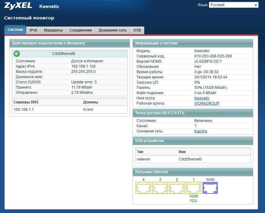 После нажатия на трафарет «Применить» интернет станет доступным. В этом можно убедиться по индикатору на передней панели роутера. При отключении кабеля провайдера от разъема WAN индикатор потухнет. Соединение пропадет на страницах «Система» и «Интернет». При подключении модема к USB-разъему ZyXEL Keenetic 4G III настройка Yota USB-модема не требуется. Роутер определит его, и мобильный интернет автоматически подключится. Об этом появиться информация на страницах интерфейса роутера. Индикатор снова загорится.