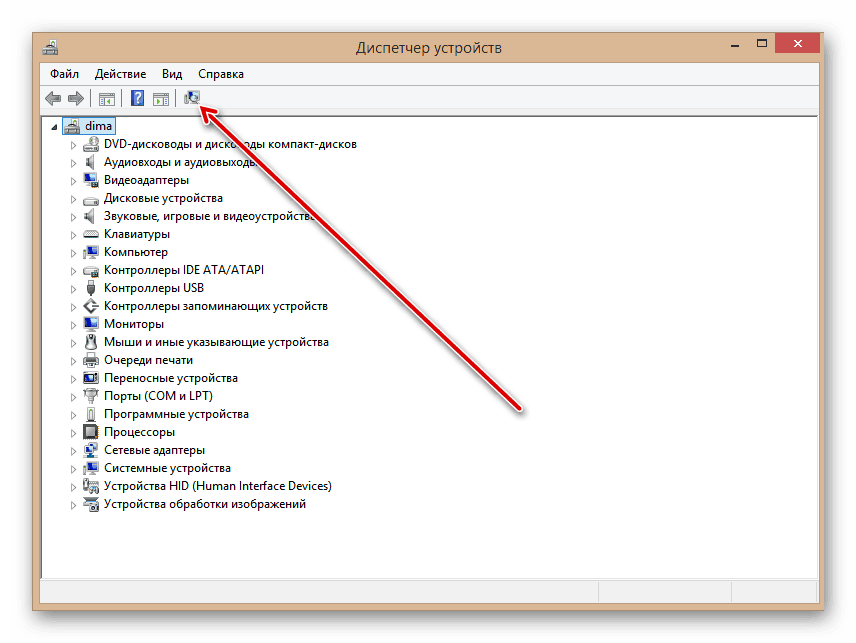 Иногда случается, что операционная система неправильно распознаёт некоторые устройства и здесь может помочь обновление конфигурации оборудования. По аналогии с Шагом 3 открываем «Диспетчер устройств» и запускаем процесс нажатием на соответствующий значок на верней панели инструментов. Не помогло? Тогда идём дальше.