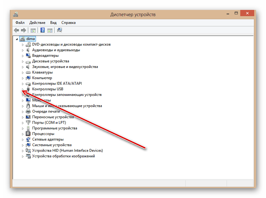 В появившемся Диспетчере устройств разворачиваем раздел «Контроллеры USB», нажав для этого на маленький значок в виде треугольника в соответствующей строке списка оборудования. Заодно обращаем внимание на наличие или отсутствие красных и жёлтых восклицательных и вопросительных знаков в перечне устройств.