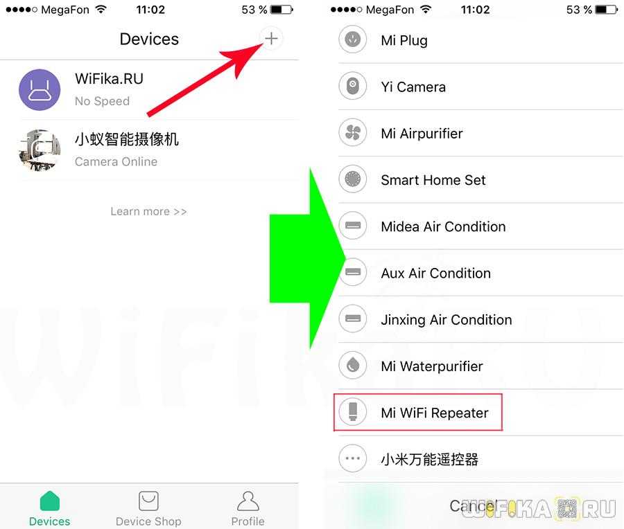 - Нажать кнопку с изображением «+» в верхнем правом углу, выбрать «Mi Wi-Fi Repeater» и коснуться «Добавить устройство». Если в списке его нет, то нажать «Сканировать».