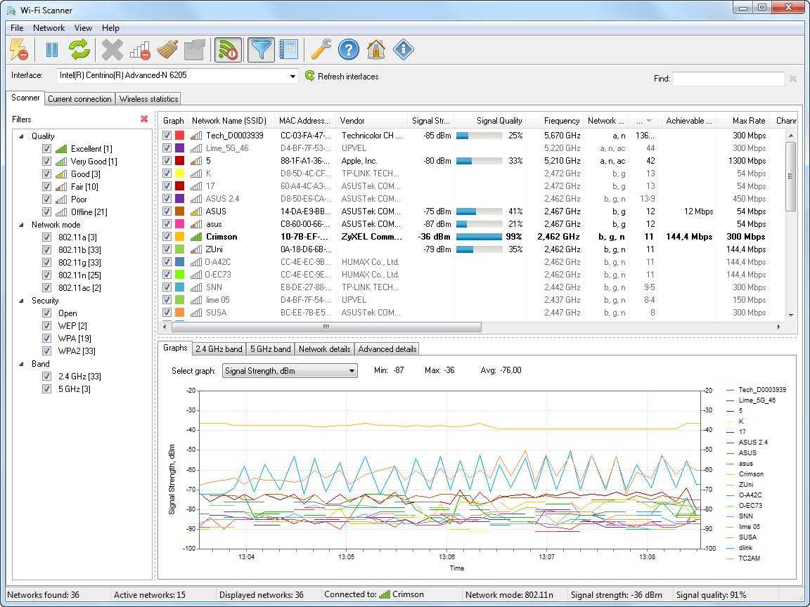 Благодаря наглядным визуальным графикам этот режим удобно использовать для выявления пересекающихся Wi-Fi сетей: