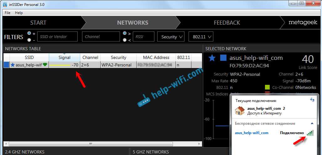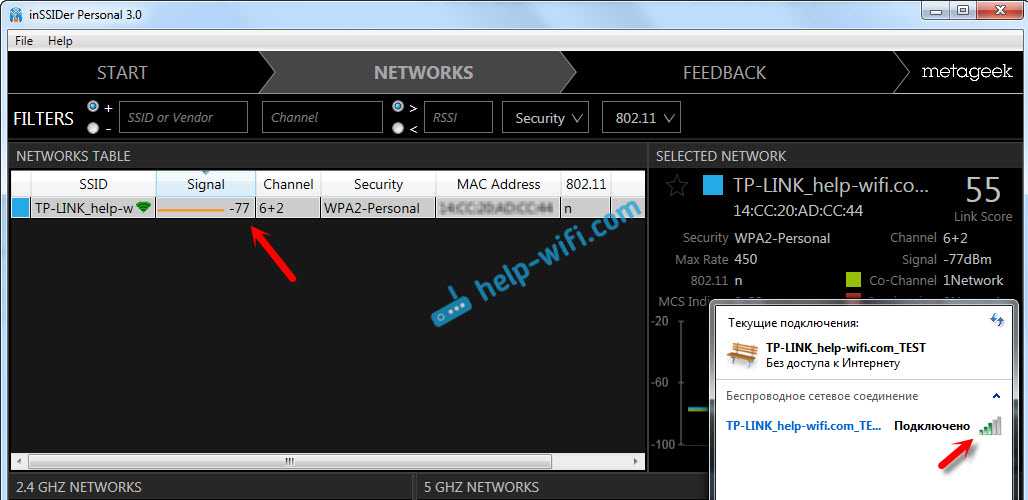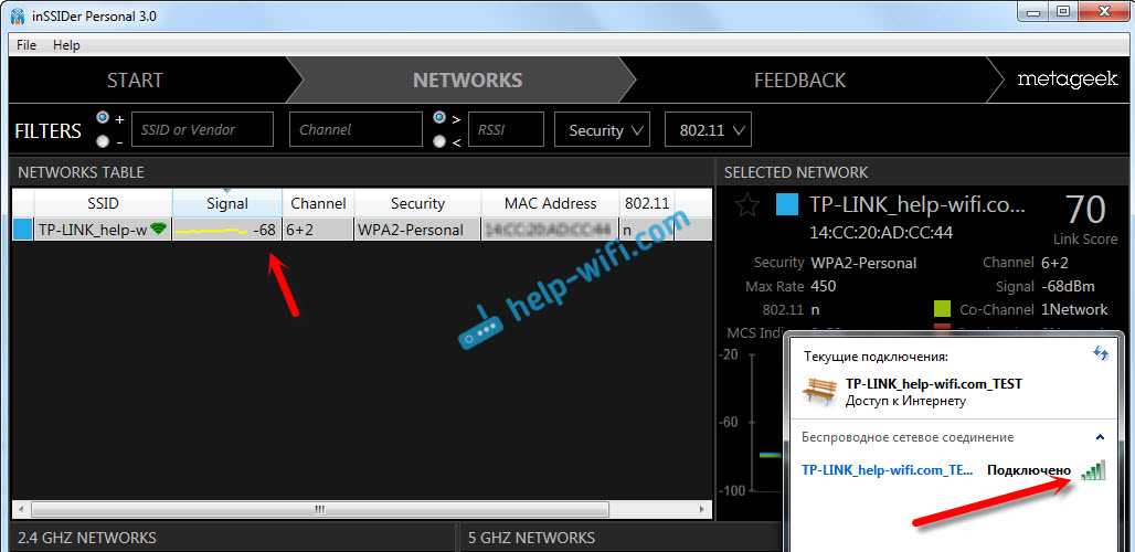 В программе inSSIDer смотрел на показатель «Signal». Чем он ниже, тем лучше. Минимальное значение вроде -25. Так же, смотрел на показатель сигнала в Windows 7. На скриншотах все это есть.