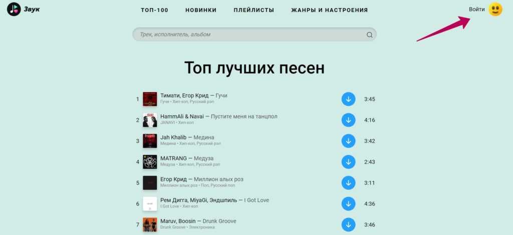 Интерфейс виртуального сервиса идентичен мобильному. Но у сайта есть одно преимущество — музыку можно слушать, не входя в аккаунт. Только в этом случае треки нельзя перемешивать, складывать в плейлисты, скачивать и т.д. Обычным пользователям доступно лишь воспроизведение композиций, поиск и постановка их в очередь.