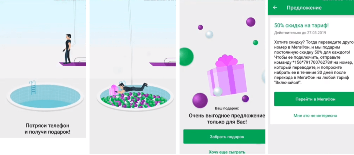 Разумеется, оператор оставляет за собой право самостоятельно определять и менять виды предлагаемых бонусов. Чуть позже обсудим, как играть в Мегафон «Тряси смартфон», пока же обсудим, что относится к разряду персональных предложений:
