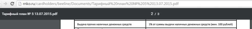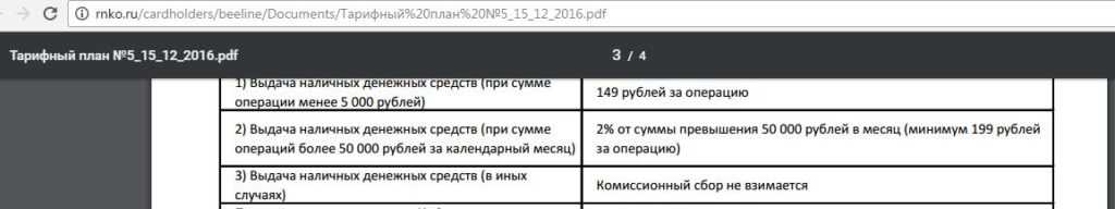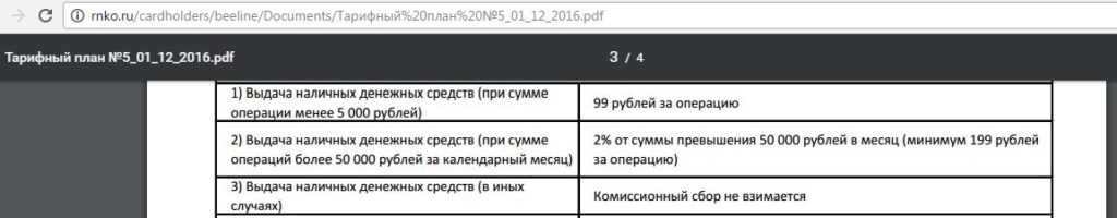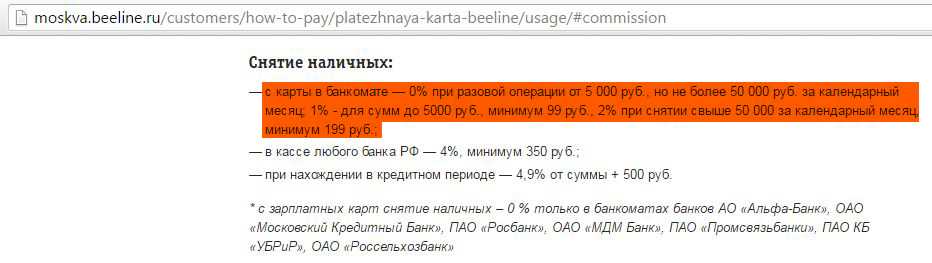 С карты «Билайн» по-прежнему можно снять до 50 000 руб. в месяц в любых банкоматах без комиссии при сумме снятия от 5000 руб. При снятии суммы меньше 5000 руб. комиссия с 15.12.2016 составит 149 рублей. При превышении порога в 50 000 руб./месяц за каждое снятие будет комиссия 2%, минимум 199 руб: