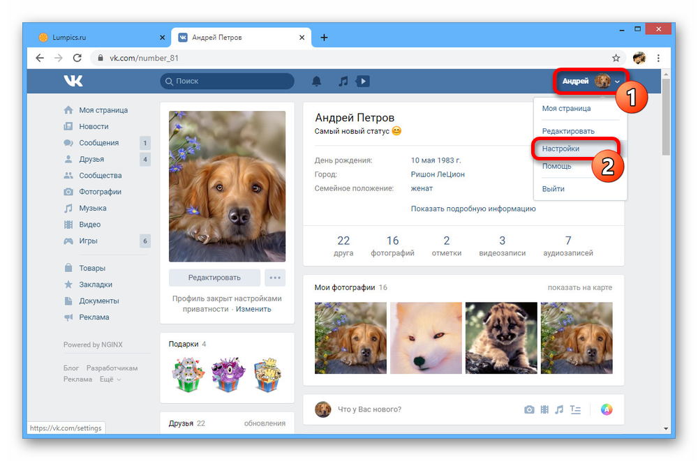- Разверните главное меню сайта, кликнув по фотографии профиля на верхней панели, и выберите «Настройки».