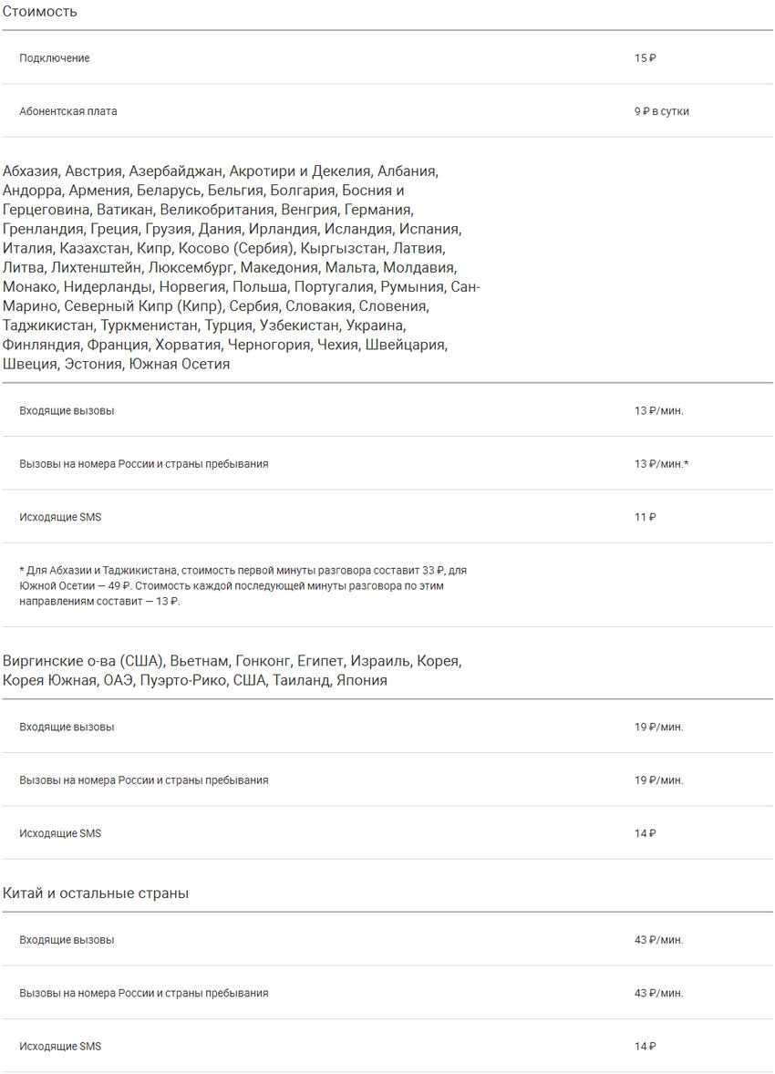 Предоставляет 40 бесплатных минут на входящие для всех регионов. Подключение — бесплатно, но за каждый день использования вы платите 59 рублей. Выгодно ли? В странах с самым дешёвым роумингом минута входящих звонков стоит 79 рублей. Считайте сами.