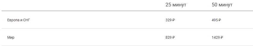 Предоставляет 25, либо 50 (на выбор) бесплатных минут на все звонки, кроме исходящих за пределы страны и не в Россию. За подключение нужно заплатить 829 и 1429 рублей, в зависимости от количества минут.