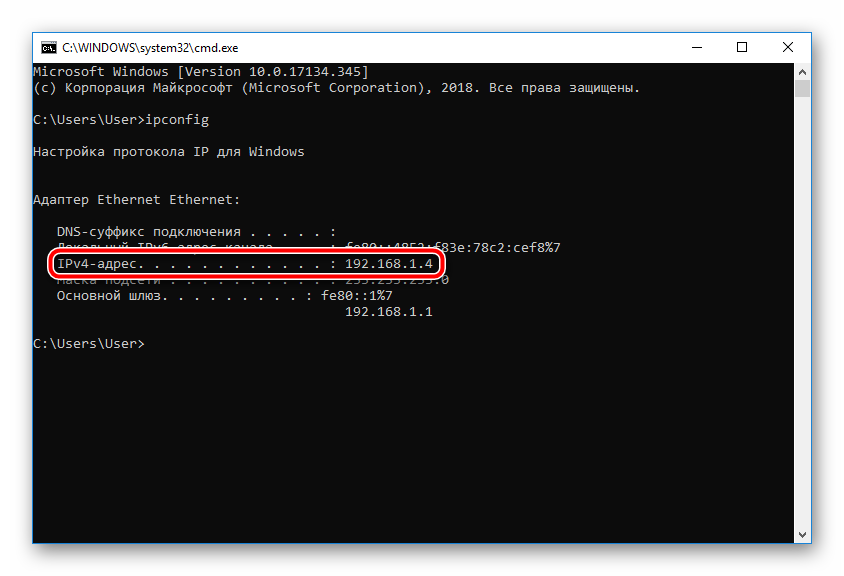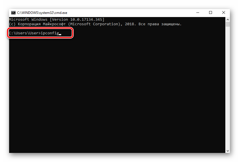 Появится командная строка Windows. Здесь необходимо отправить команду «ipconfig».