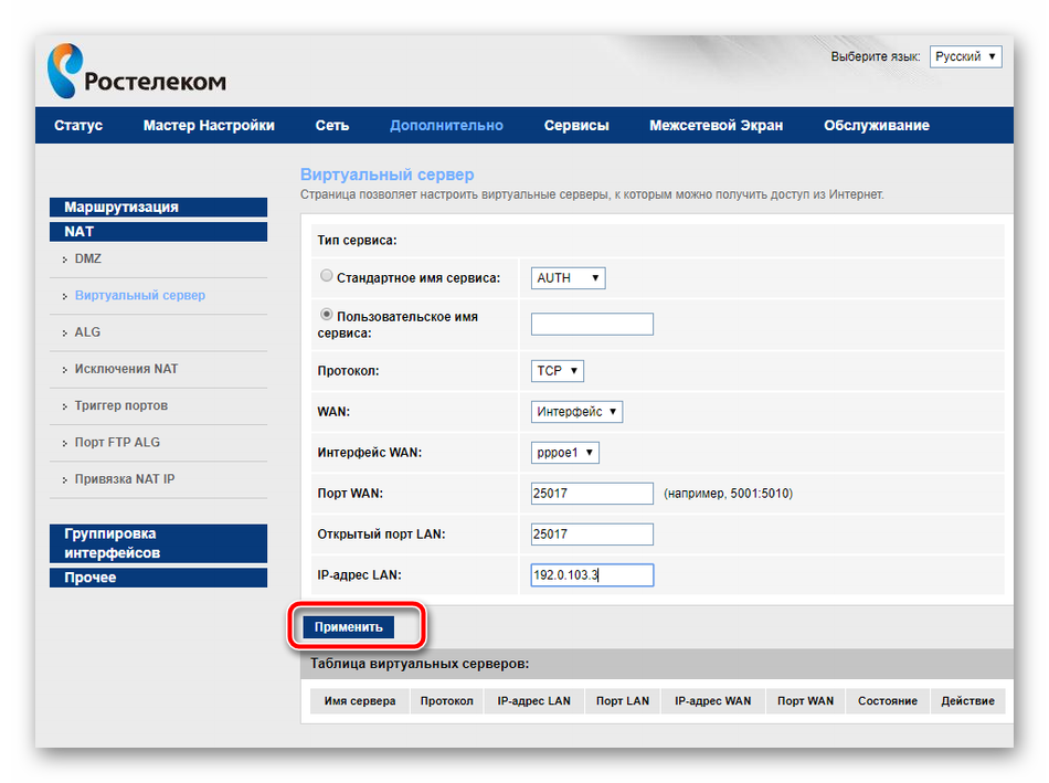 Применяем внесённые изменения и видим в списке серверов новый, созданный нами порт. Надеемся, вопросов по поводу того, как открыть порты на роутере Ростелеком у вас не осталось.