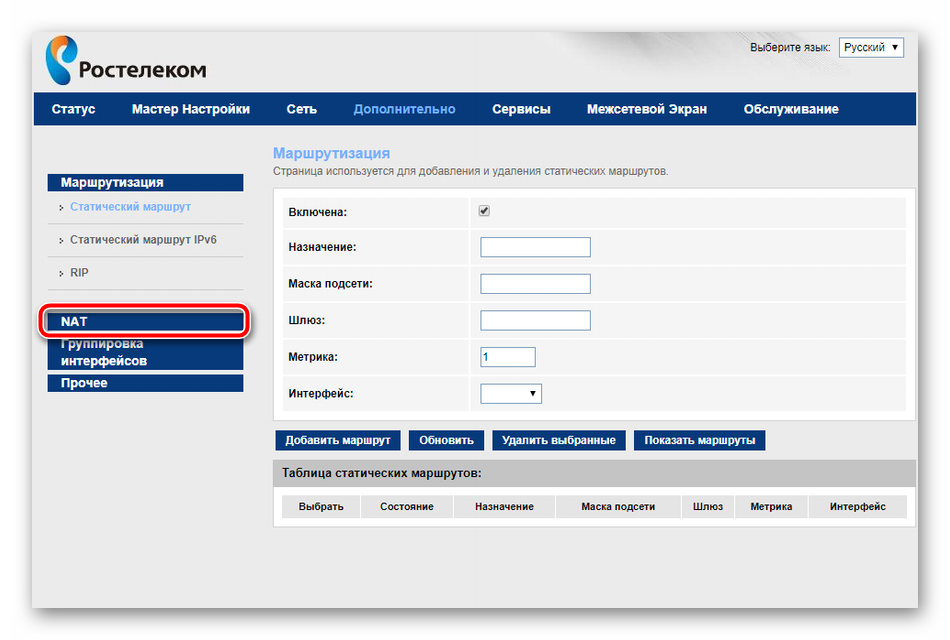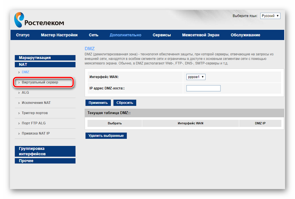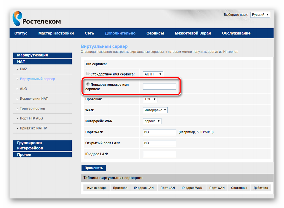 Открытие портов на роутере Ростелеком ничуть не сложнее, это бывает необходимо при работе торрент-программ, а также клиентских приложений различных игр. Чтобы создать необходимый вам порт войдите в основное меню настроек роутера, в нём выберите «Расширенные настройки», затем подменю «NAT». В поле интерфейса необходимо выбрать интерфейс подключения (указан в документации). После этого переходим в раздел виртуальных серверов и указываем в нём: