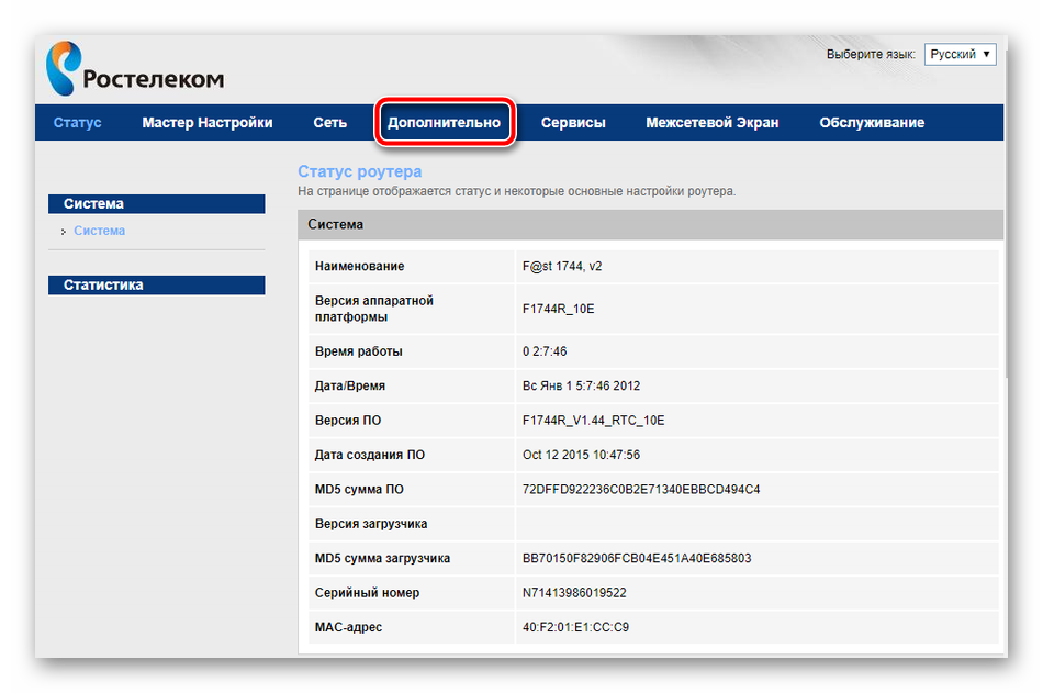 Рисунок 3. Визуальный интерфейс админ панели на роутере Ростелеком