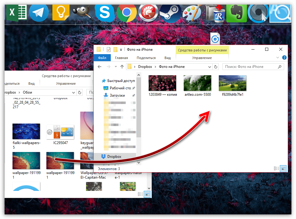 - Откройте на компьютере папку Dropbox. Переместите в нее фотоснимки. Начнется процесс синхронизации, длительность которого будет зависеть от количества и размера выгружаемых фотографий, а также скорости вашего интернет-соединения.