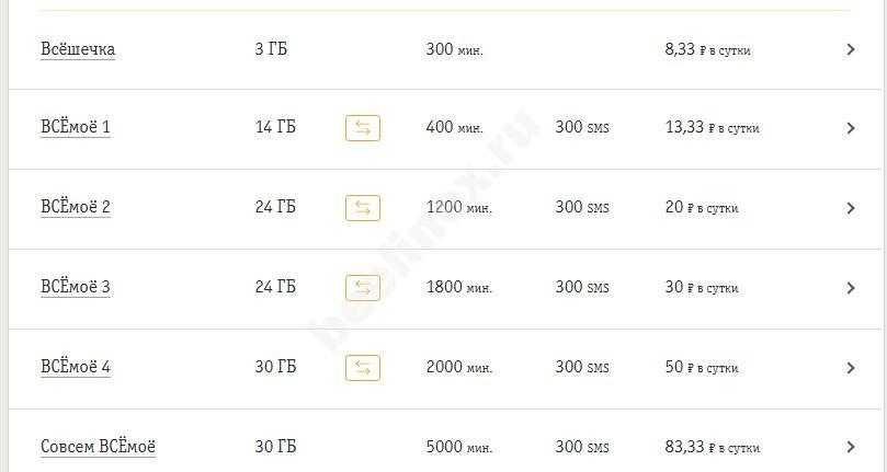- Список опций и подробная информация о тарифном плане «Мой Билайн».