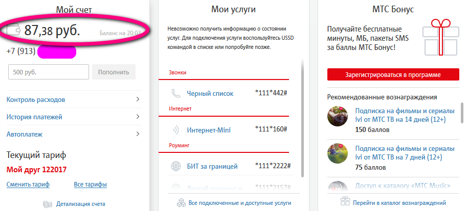 - В личном кабинете на портале или в мобильном клиенте «Мой МТС». Сервис позволяет не только осуществлять оплату и подключать услуги связи и интернета, но и отслеживать состояние счета, заказывать детализацию и т. д.