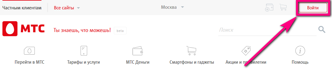 В окошке входа ввести свой сотовый номер и пароль, после чего нажать кнопку «Войти». Если пароль забыт или ещё не был придуман, посетитель официального сайта МТС может сгенерировать одноразовый, воспользовавшись выделенной цветом ссылкой рядом с кнопкой.