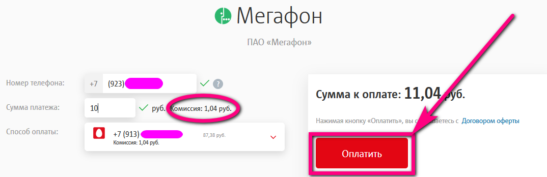 - Списание за отправку средств внутри сети Мегафон – 6 процентов от суммы платежа.