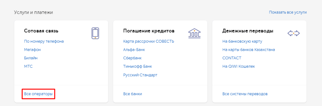 - В разделе «Оплата услуг» выбрать подходящий сотовый оператор.