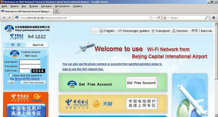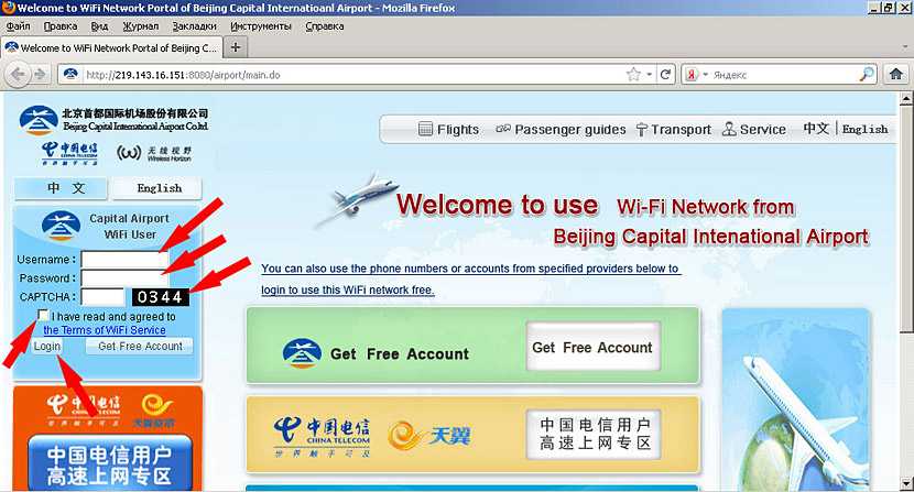12. Возвращаемся к ноутбуку, где в левом верхнем углу главной странички аэропорта вводим с распечатки Username и Password, а также цифры в черном прямоугольнике. Отмечаем пункт I have read and agreed to Terms of WiFi Service. Жмем на кнопку Login.