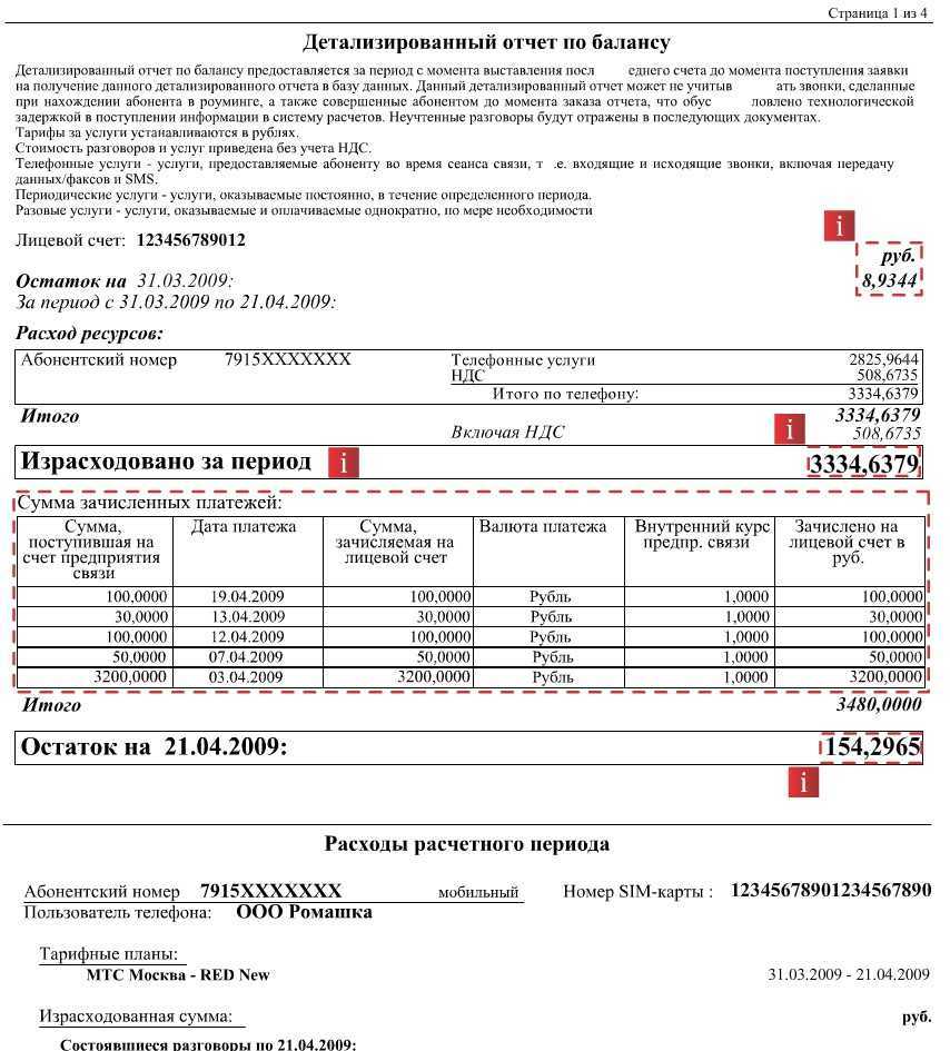 Детализированный отчет по балансу предоставляется с момента выставления последнего очередного счета до момента поступления заявки на получение данного счета. Содержит общую информацию о расходах за период и информацию с детализацией по предоставленным услугам.