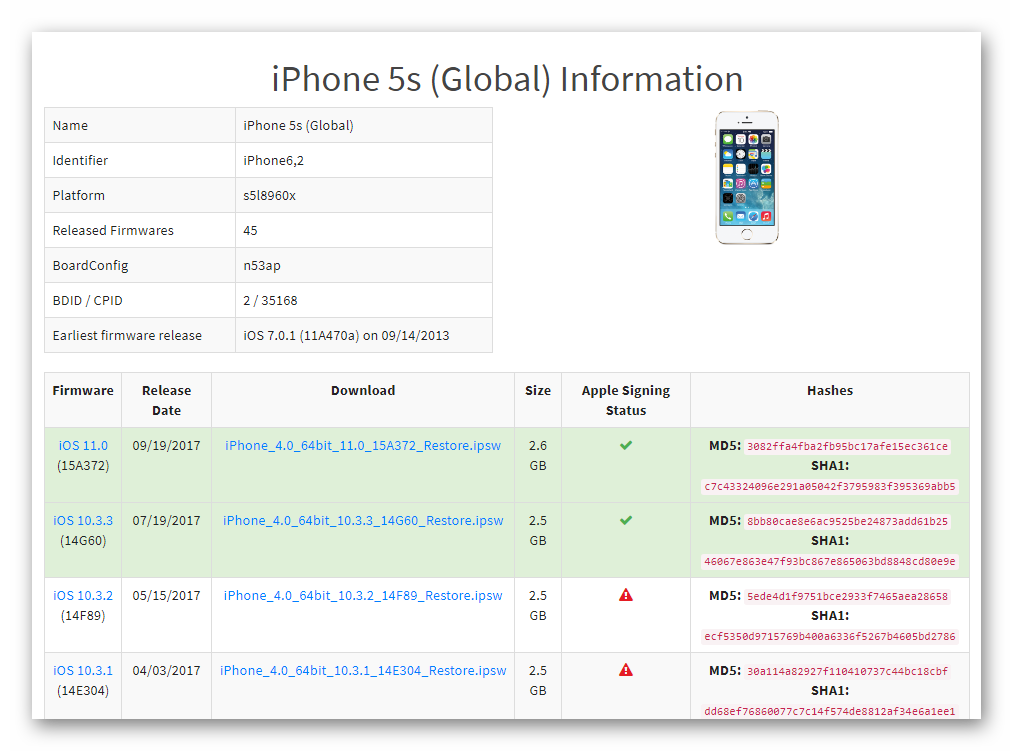 Прежде чем переходить к установке прошивок в iPhone 5S, необходимо получить пакет, содержащий компоненты для инсталляции. Прошивки для установки в iPhone 5S – это файлы *.ipsw. Следует учитывать, что инсталлировать удастся только последнюю версию системы, выпущенную Apple для использования в качестве операционной системы девайса. Исключением являются версии прошивок, предшествующие новейшей, но устанавливать их получится лишь в течении нескольких недель после официального релиза последней. Получить нужный пакет можно двумя путями.