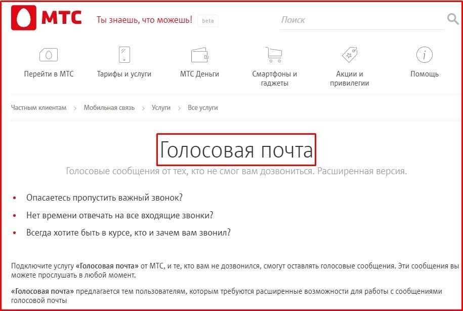 . Для подключения или отключения, а также проверки статуса голосовой почты можно обратиться в справочную службу по номеру . Способ хорош тем, что доступен в любых условиях, и его можно советовать пожилым или неопытным абонентам, которые могут испытывать затруднения с самостоятельным управлением услугами, но справятся, используя подсказки оператора.