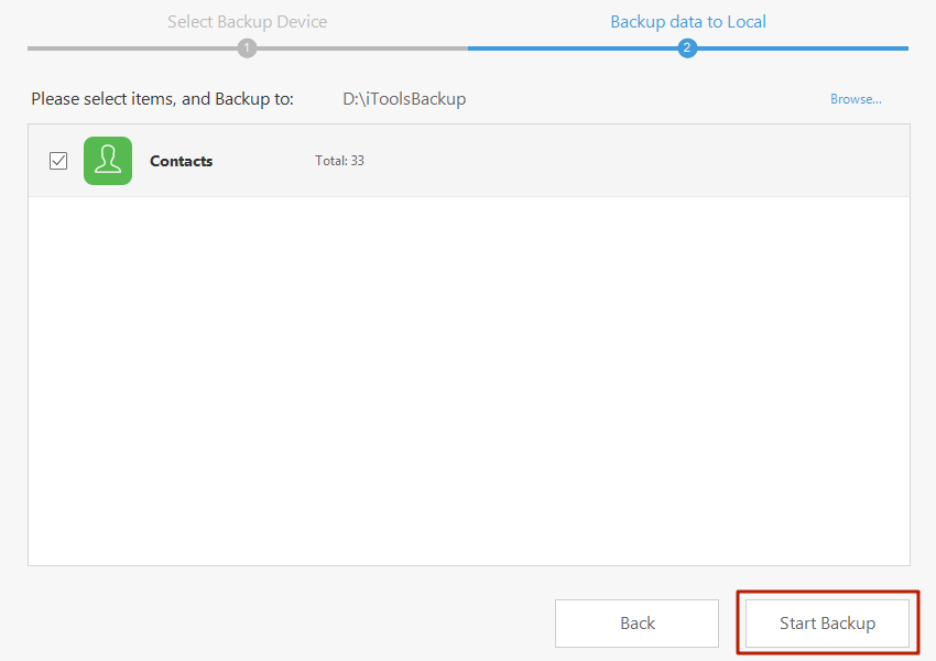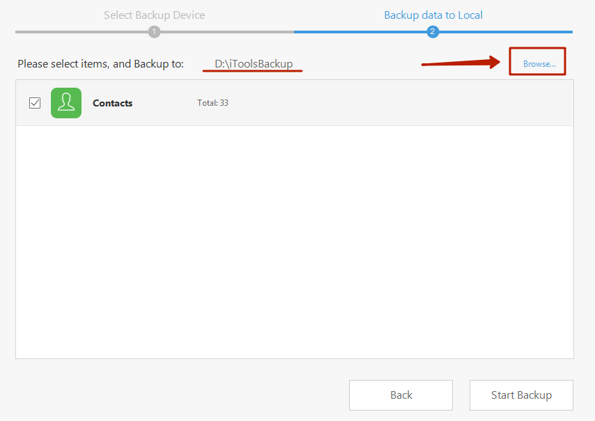 Шаг 5. Следующим появится окно, где вы сможете определить путь сохранения – делается это через кнопку «Browse». По умолчанию путь таков: D:iToolsBackup.