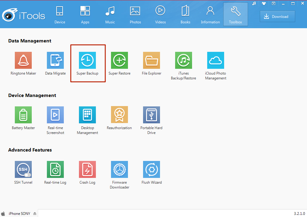 Шаг 3. В блоке «Data Management» выберите пункт «Super Backup».