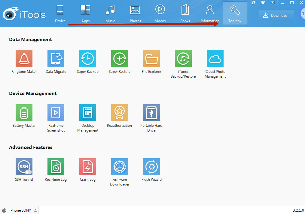 Шаг 2. Перейдите из раздела «Device» в раздел «Toolbox».