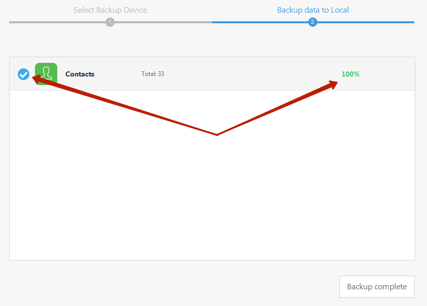 Если в копию входят только «Контакты» (как в нашем случае), то ее создание займет не более секунды. При сохранении тяжелых файлов (видео или музыки) придется ждать куда дольше. Признаки завершения процесса – значение в 100% справа и галочка слева.