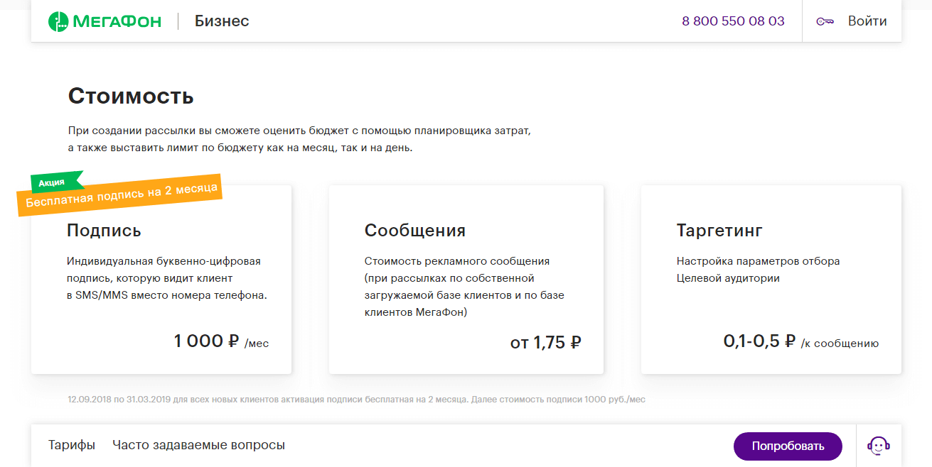 - Подпись (абонентская плата – 1 тысяча рублей/месяц плюс два месяца бесплатного пользования в рамках акции). Именно буквенную или цифровую подпись будет видеть получатель рассылки вместо привычного номера.