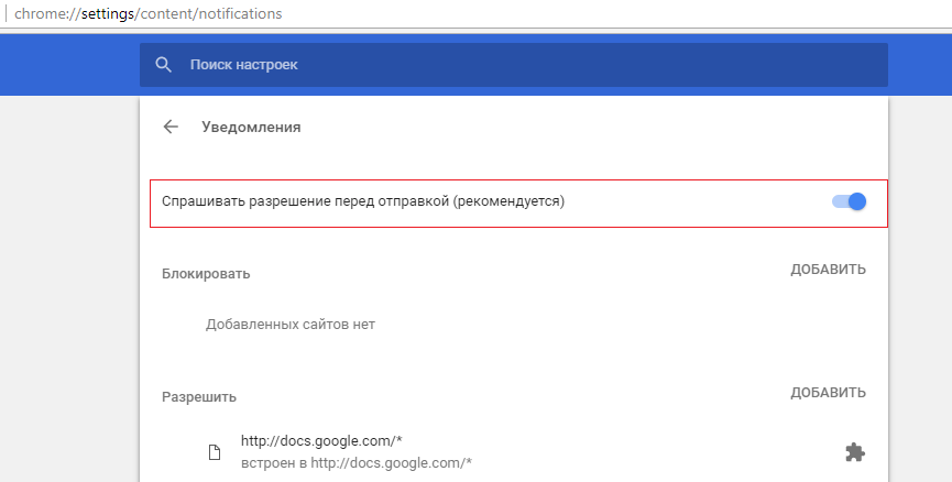 Можно вручную разрешить или заблокировать определенным сайтам показывать push-уведомления. Чтобы полностью запретить показывать уведомления в Chrome для всех сайтов, отключите опцию Спрашивать разрешение перед отправкой (рекомендуется)