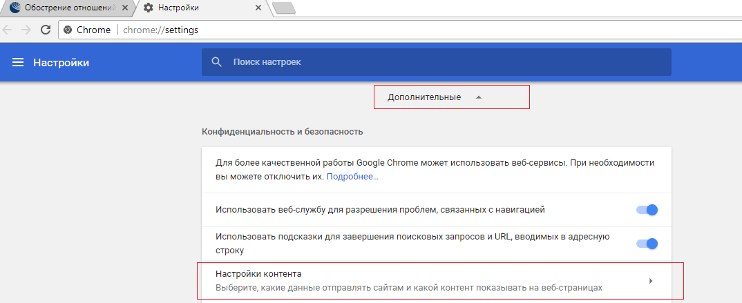 - В большом блоке «Конфиденциальность и безопасность» щелкаем по строке «Настройки сайта».