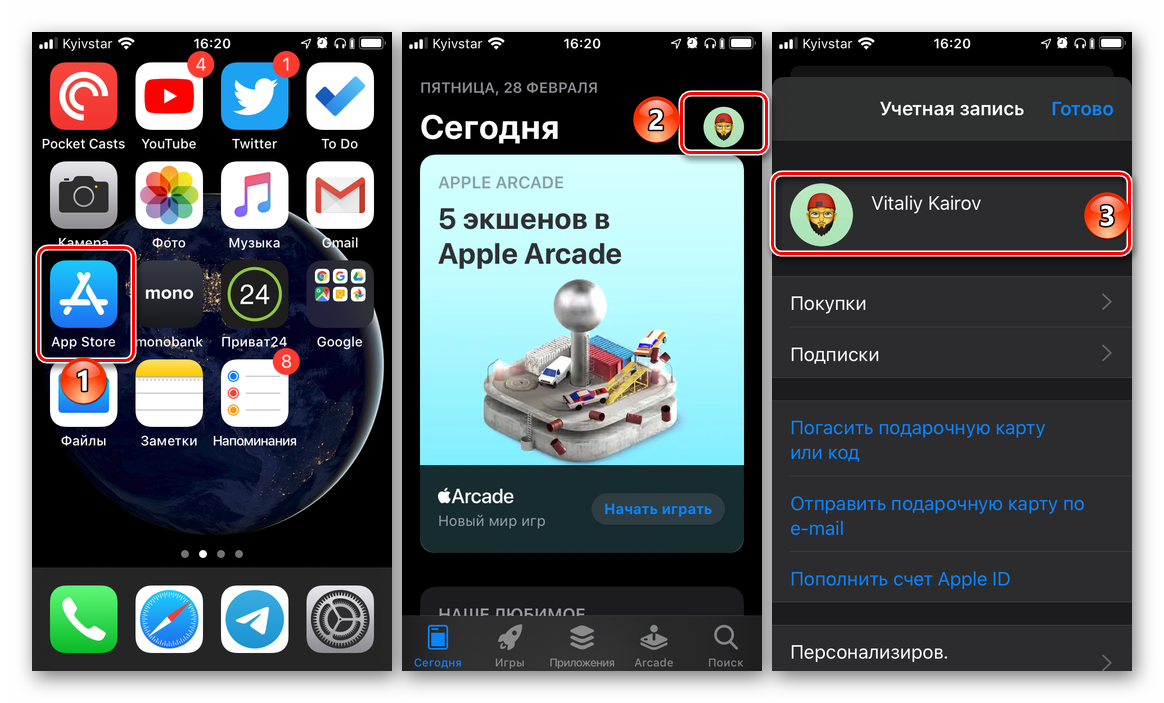 - Откройте App Store и, находясь во вкладке «Сегодня», тапните по изображению своего профиля, а затем еще раз по нему, но уже в открывшемся разделе «Учетная запись». Подтвердите переход посредством Touch ID или Face ID.
