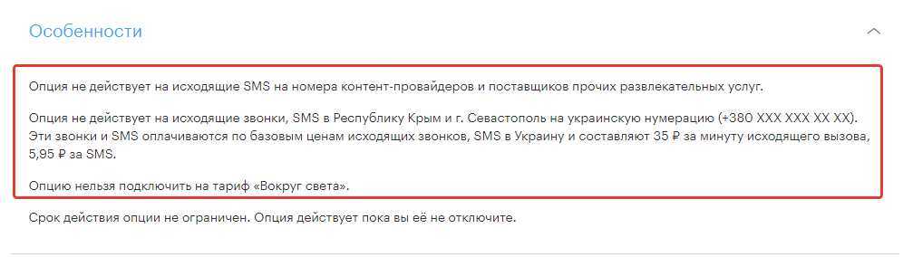 За входящие звонки клиенту не придется платить. Исходящие же в иные регионы РФ на любые номера стоят 3 руб./мин. Срок действия опции «Вся Россия» не ограничен, а территория охватывает всю страну, за исключением дома, Севастополя и Крыма. Условия предоставления трафика зависят от вашего тарифа и активированных интернет-опций