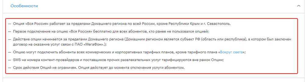 Подключение «Вся Россия» МегаФон даст вам возможность выгодно звонить из ДР и в поездках по стране на номера телефонов других операторов. Вот только на номера поставщиков развлекательных услуг и контента она не распространяется. Причем функция не совместима с некоторыми тарифными планами и прочими опциями. Чтобы уточнить эту информацию по конкретно вашему стартовому пакету, необходимо зайти в Личный кабинет Мегафона или позвонить в колл-центр (0500).