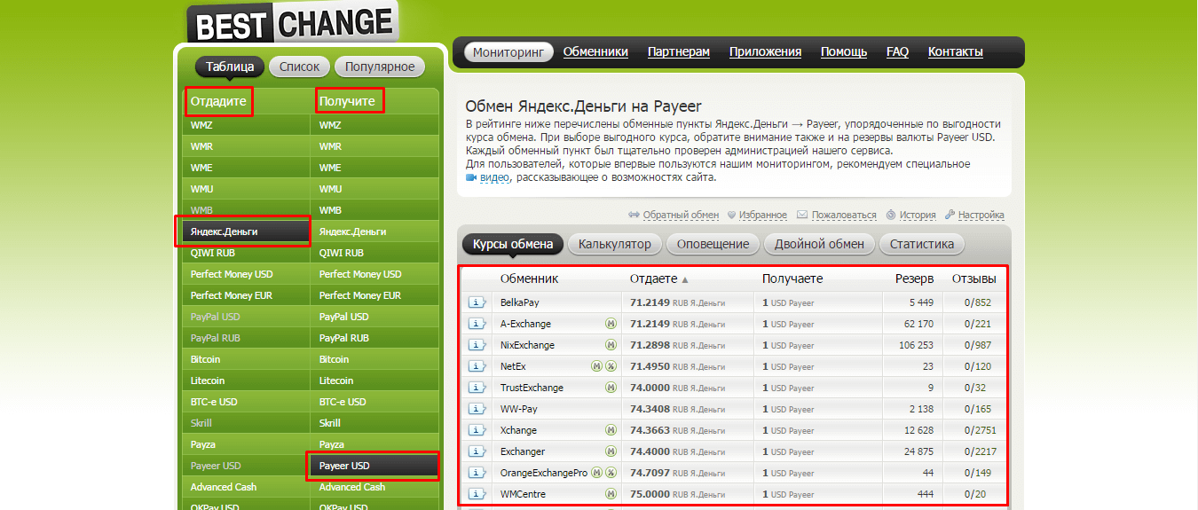 Для пополнения вам нужно будет скопировать свой номер кошелька Payeer, перейти на сайт мониторинга обменника, в таблице в поле «Отдадите» ввести удобный для вас способ пополнения, а в поле «Получите» указать Payeer USD. После этого все обменники отсортируются по лучшему курсу и вам останется выбрать один их них. Так же вы можете почитать отзывы про каждый обменник.