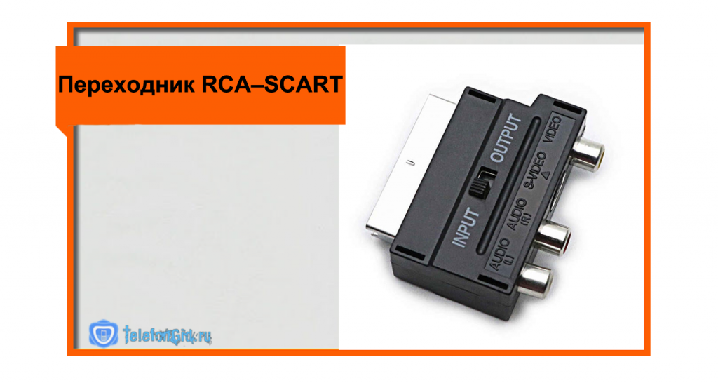 Когда ТВ имеет на задней панели разъем SCART, можно воспользоваться переходником RCA–SCART, он входит в базовый комплект оборудования. Этот тип подключения отличается металлической коробкой, которая имеет 20 встроенных контактов.