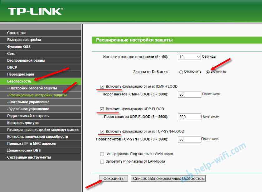 - Включить фильтрацию от атак TCP-SYN-FLOOD.