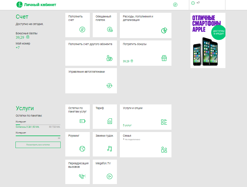 - потратить бонусы (начисляется по 1 бонусному баллу за каждое пополнение счета на 30 рублей, потратить их можно на бесплатные минуты, SMS, интернет и услуги «Аэрофлота» по программе «Мили»);
