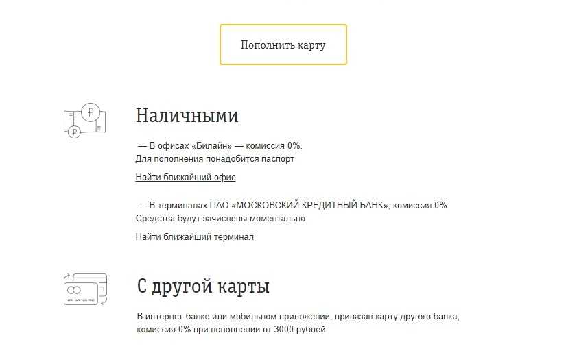 Как и для любой другой карты, предусмотрено зачисление средств наличными иди переводом со счета. Если держатель использует устройства, находящиеся не в салонах Билайн или через кассы банков, то придется заплатить комиссию при пополнении. Бесплатно увеличить баланс можно следующими способами: