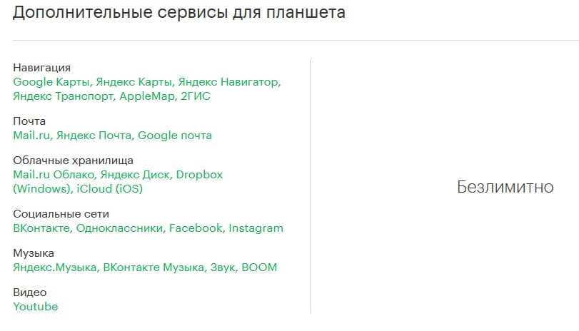 - Безлимитные мессенджеры и соц. сети: WhatsApp, Viber, Facebook Messenger, Snapchat, eMotion, ТамТам, ВКонтакте, Одноклассники, Facebook, Instagram, Twitter;