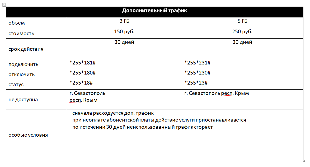 | особые условия | — сначала расходуется доп. трафик- при неоплате абонентской платы действие услуги приостанавливается- по истечении суток неиспользованный трафик сгорает | — сначала расходуется доп. трафик- при неоплате абонентской платы действие услуги приостанавливается- по истечении 30 дней неиспользованный трафик сгорает |