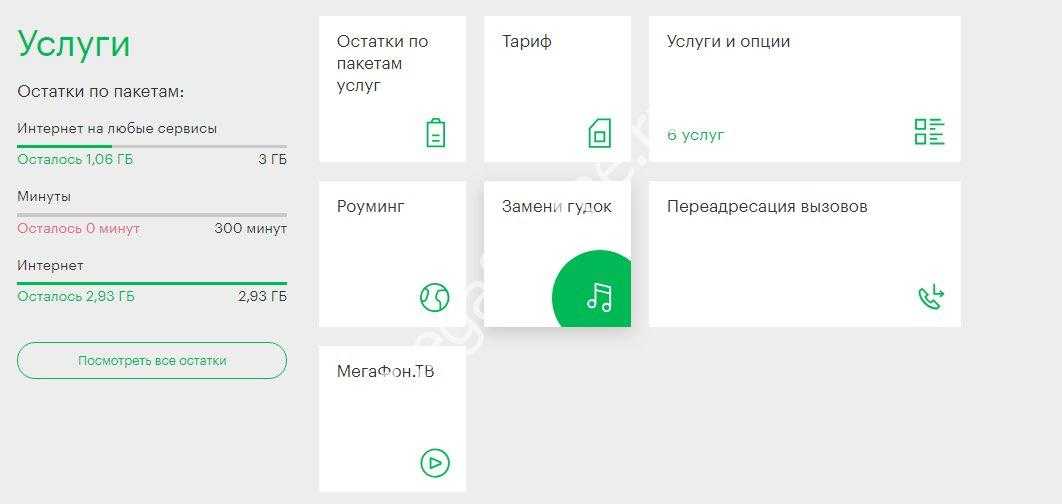 Показывает остатки трафика, минут и SMS в подключенных пакетах. Здесь же можно узнать условия и стоимость вашего тарифа, посмотреть какие услуги подключены и отказаться от них, либо подключить другие.